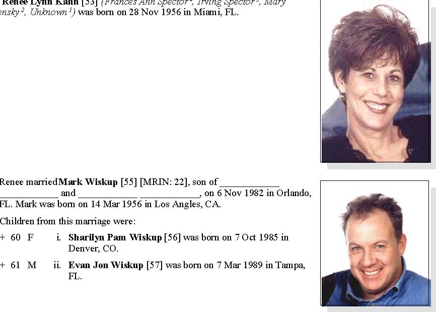 Renee married Mark Wiskup [55] [MRIN: 22], son of ____________ ____________ and ____________ ____________, on 6 Nov 1982 in Orlando, FL. Mark was born on 14 Mar 1956 in Los Angles, CA.