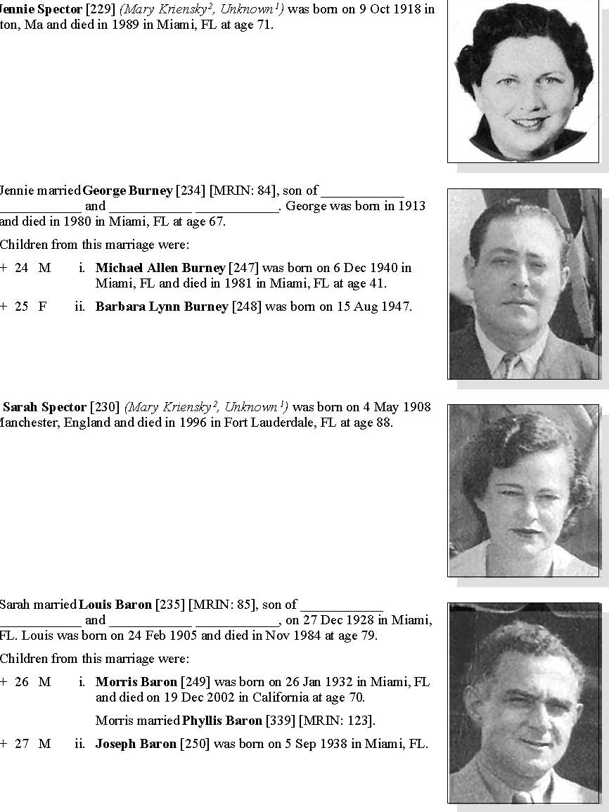 + 10 F viii. Sarah Spector [230] was born on 4 May 1908 in Manchester, England and died in 1996 in Fort Lauderdale, FL at age 88.