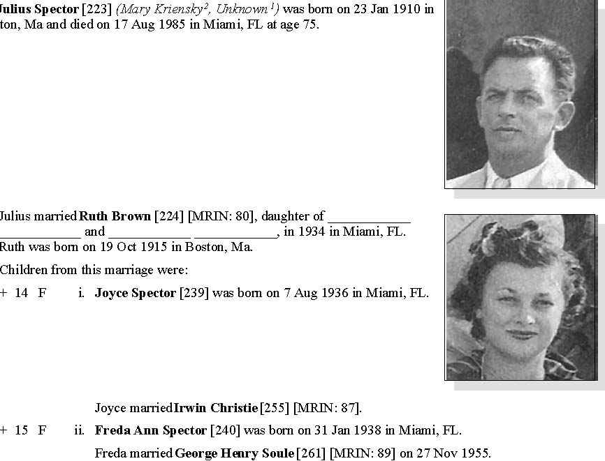 15. Freda Ann Spector [240] (Julius Spector 3, Mary Kriensky 2, Unknown 1) was born on 31 Jan 1938 in Miami, FL.